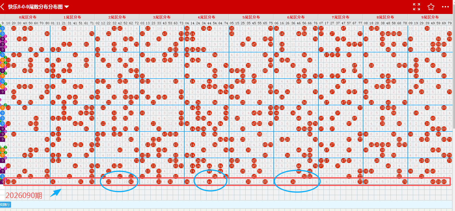 从2026090期重码走势图上看,画蓝色方框图标的是开出来的重码,开出了4个(蓝色方块标示的),重码数量与上期减少;从重码图上看,近10期重码下号数量有呈现降温的趋势。从近期重码下号数量的比对,可以发现中奖号码数量在1-10个号码之间均衡下号。综合推断本期重码热度回温概率极大,本期推断可以参考7个左右(蓝色箭头标示的);建议多加关注(04、10、36、44、62、65、69);