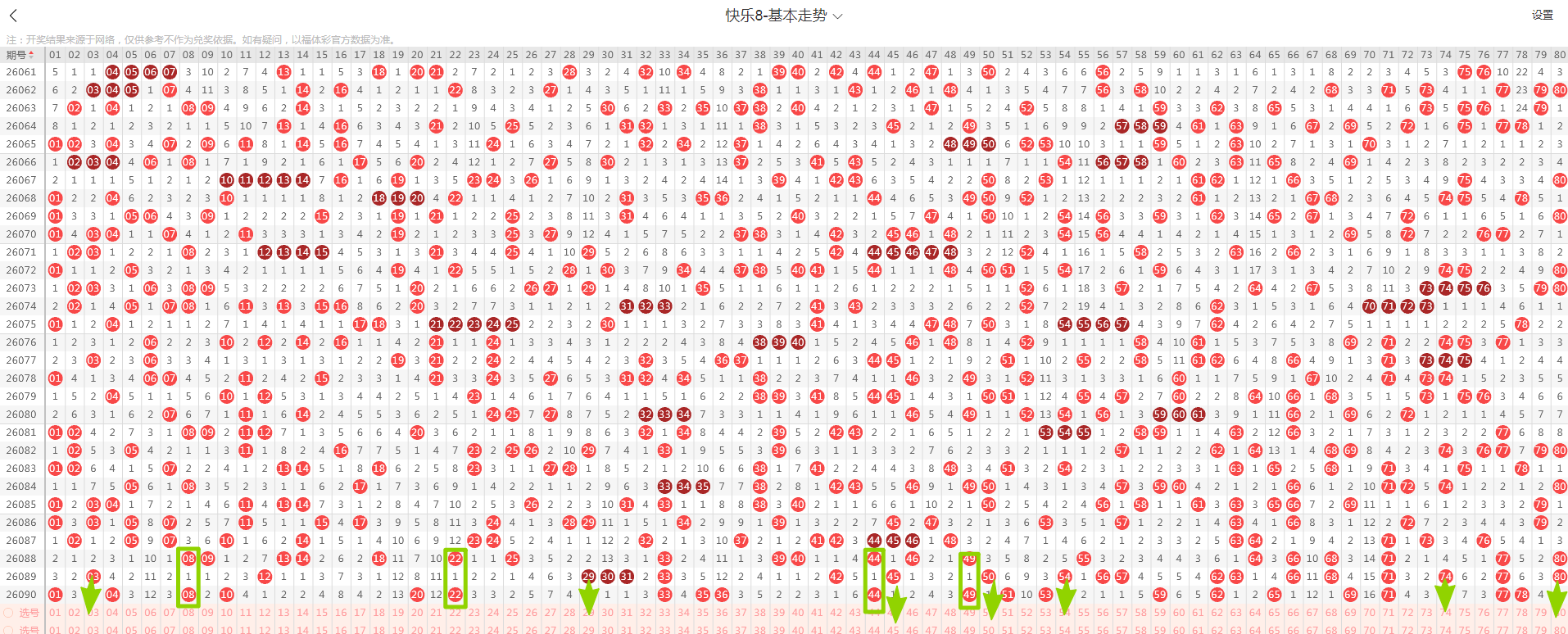 从这张走势图可以看到绿色方框标出来了遗漏一期的示意号码,开出了隔期(遗漏一期的)4个号码(绿色方块标示的),数量与上期增加,从近期走势图看隔期码回温态势形成,本期判断热度继续回温,落号7个号码概率较大(绿色箭头标示的03、29、45、50、54、74、80)需要关注,有下号概率;