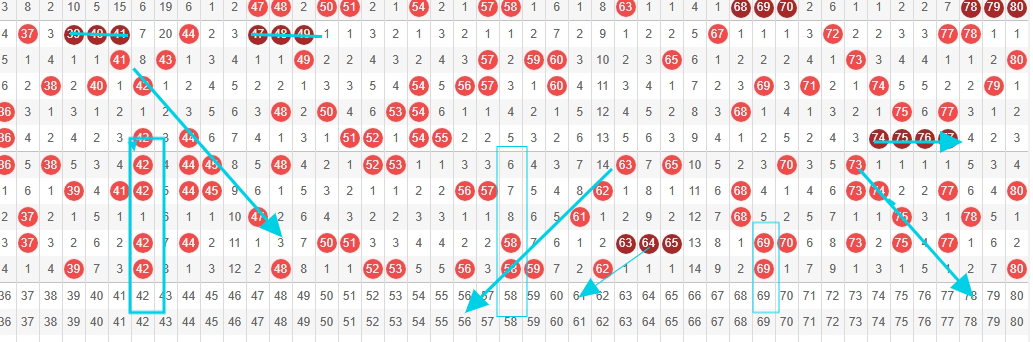 • 第四区(61 - 80):上期开出 62、69、80 三个号码,热度下降。本期可关注 61、63、65、69、78,61 号从遗漏周期和号码的冷热交替规律来看,具备出现条件;63 和 65 号从整体走势以及与上期号码的关联上,有一定热度延续可能;69 号作为上期号码,有重号概率;78 号从该区域近期的号码分布和走势特点上分析,有较大的出号几率 。