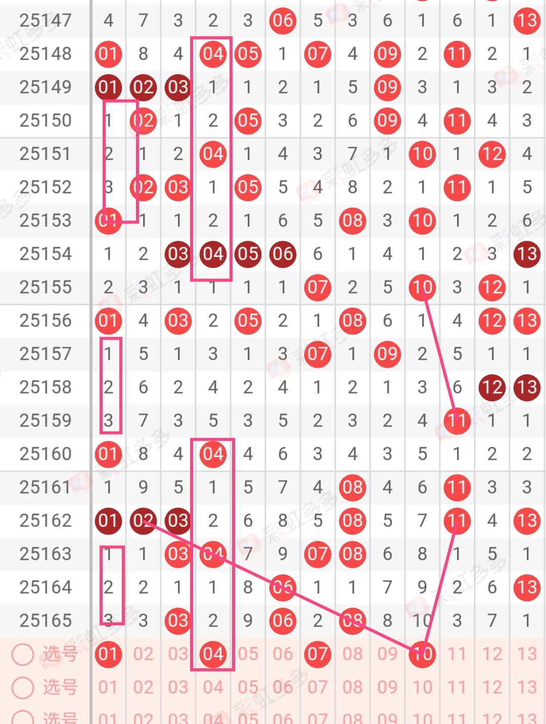 今天推荐的第一组号码底下一共有四个,大家看到了01.04.07.10,首先我们说01,大家看到了它是隔三隔二、隔三隔一隔三的一个间隔对称的一个走势。是可以考虑的,近期的开奖过程当中,很多的间隔对称都会开出来,然后04大家看到那个红框里头的上面是间隔二,中间隔了5,下面又是隔2,同时它跟03又形成了一个三角斜连走势。这个04是今天的一个重点号码,还有这个07可以去考虑,为什么?因为在历史的开奖过程当中,经常会出现1-4-7这一个经典的号码,那十号呢?我们看到有两个走势,第一个就是二四六八十的一个隔一斜连走势,然后还有一个11的,一个隔三对称走势,所以今天1714、70这四个号码,大家可以打一个4选3的复式,但是重点号码推荐04。
