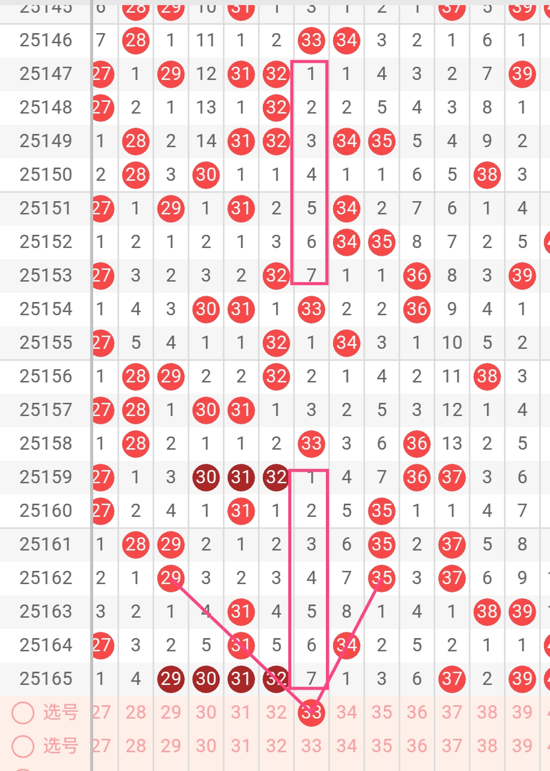 推荐的第二个号码是33号,大家可以从下图里头看出,首先33本身是一个隔期,隔三隔七的对称隔期走势。同时他还具备35.34.33的隔音斜连走势以及。29.31.33的斜链走势,同时我们看到27.28.29三斜连隔一期出31.32. 33,这是一个很对称的走势,所以33是今天的一个重中之重。