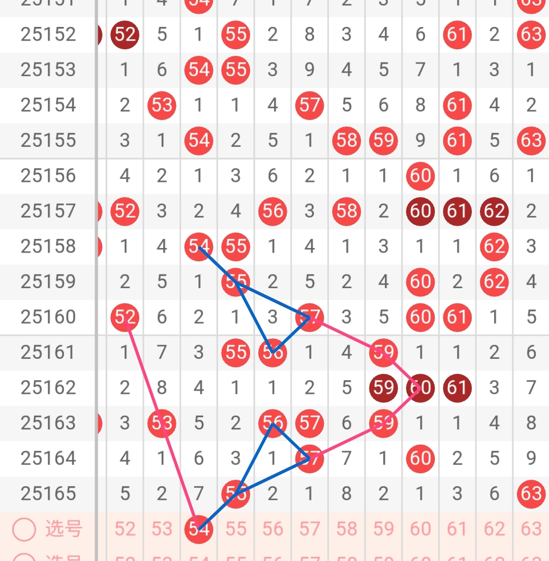 今天给大家推荐的第三个号码是54号,由于昨天我们推荐的是55号,它就是按照6059格一除57格隔一除55的一个对称走势,同样54号今天感觉可以延续着他上期的那个对称走势继续往下走。同时54号还具备一个52.53.54的隔二间隔斜连,所以今天54号也是一个重点
