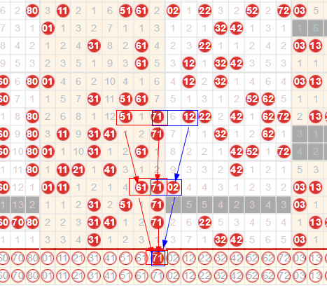 最后一个号码是根据尾号推荐给大家的一个71,首先大家看红色框里标注的。51.71,然后隔了三期出现了61.71,然后再隔三再出71,它是一个典型的直角三角的图形,然后蓝色方框里的71.12,然后隔三期出71.02,然后再往下是71。所以今天这个71我个人考虑它可以当做金丹使用,不知道大家怎么看