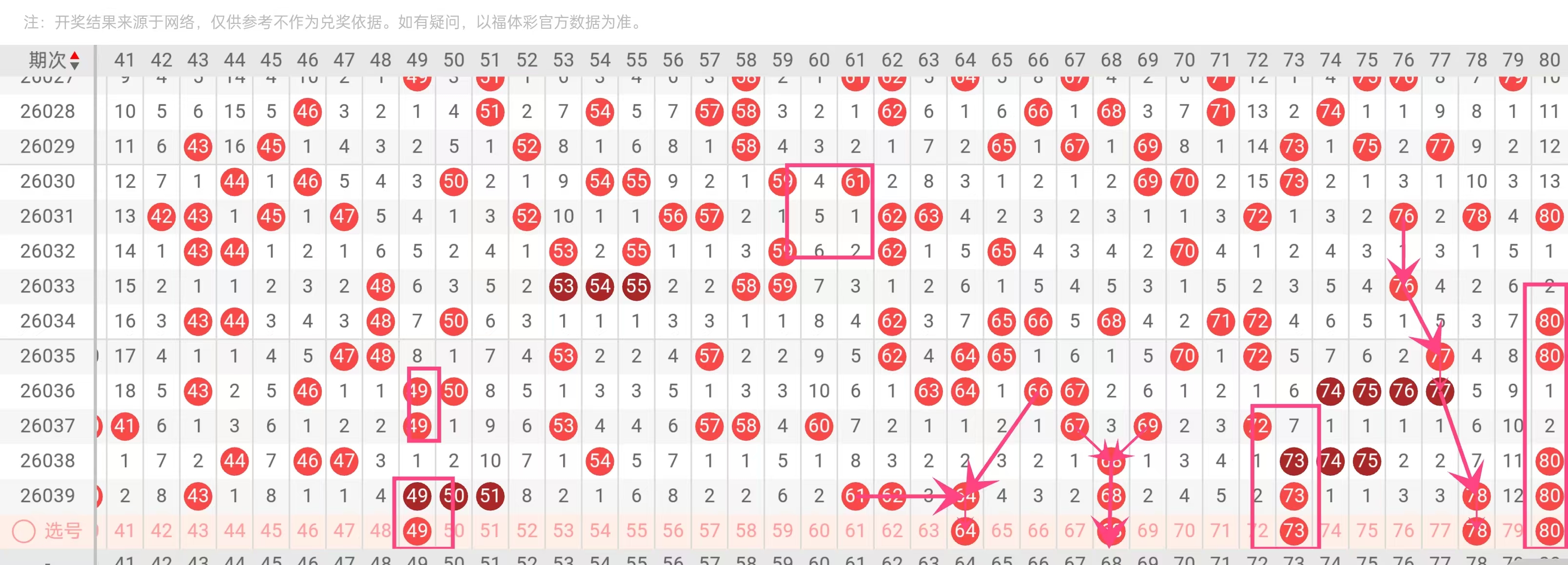 理由:近5期出现3次(2026039、2026038、2026035),属于高热号码。80是最大号码,常作为区间极值点出现,且近期高频出现在尾区(70-80),显示大号区域活跃,追热原则下仍可关注。