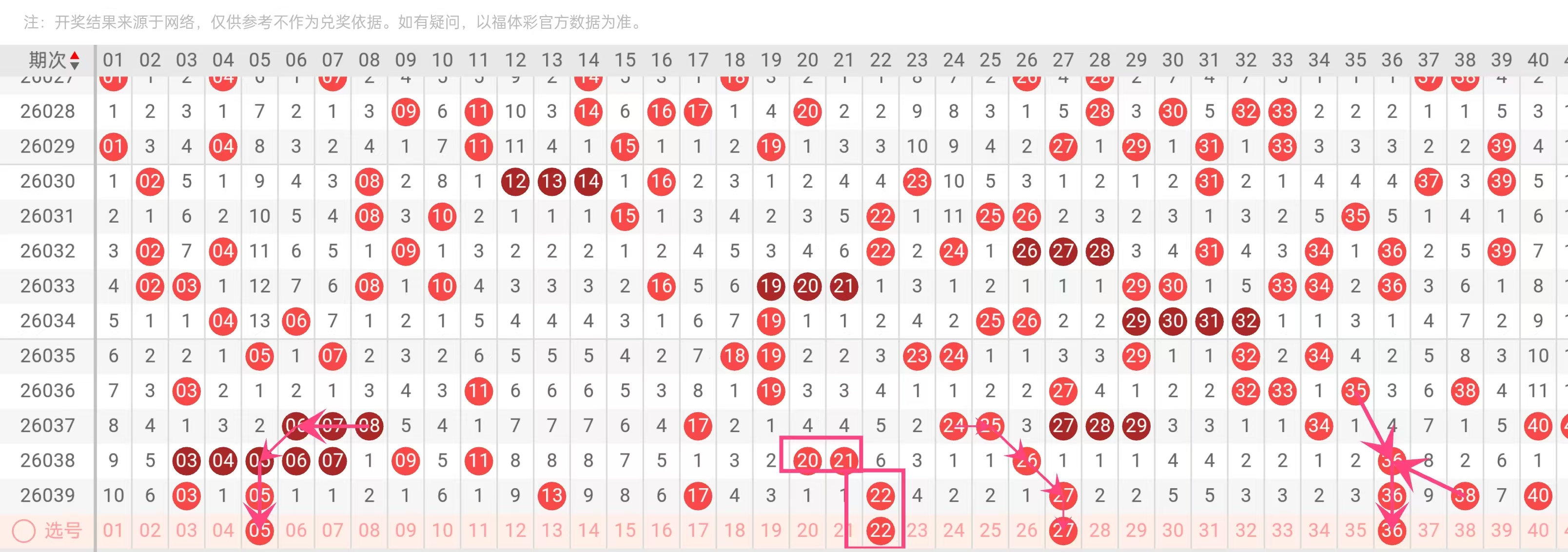 理由:近5期出现2次,但遗漏1期后于2026039期复出,属于回补型号码。22位于20-30活跃区间,且是偶数,符合近期偶数偏强趋势,适合作为回调胆码。
