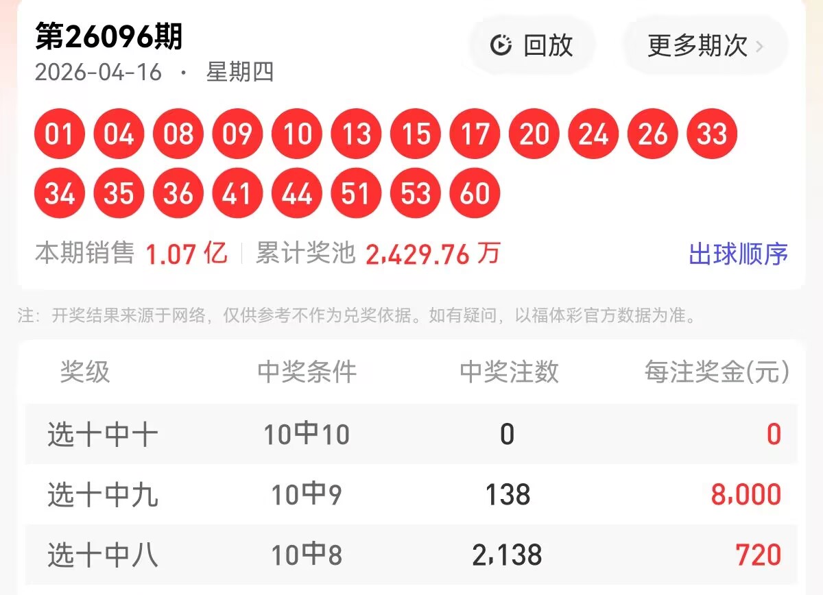 上期福彩快乐8第 2026096期开奖号码为【01 04 08 09 10 13 15 17 20 24 26 33 34 35 36 41 44 51 53 60】,其中大小比5:15,奇偶比为10:10,和值为534,跨度59,四区间比为9:6:5:0。下面是对本期对于每个号码的详细分析。