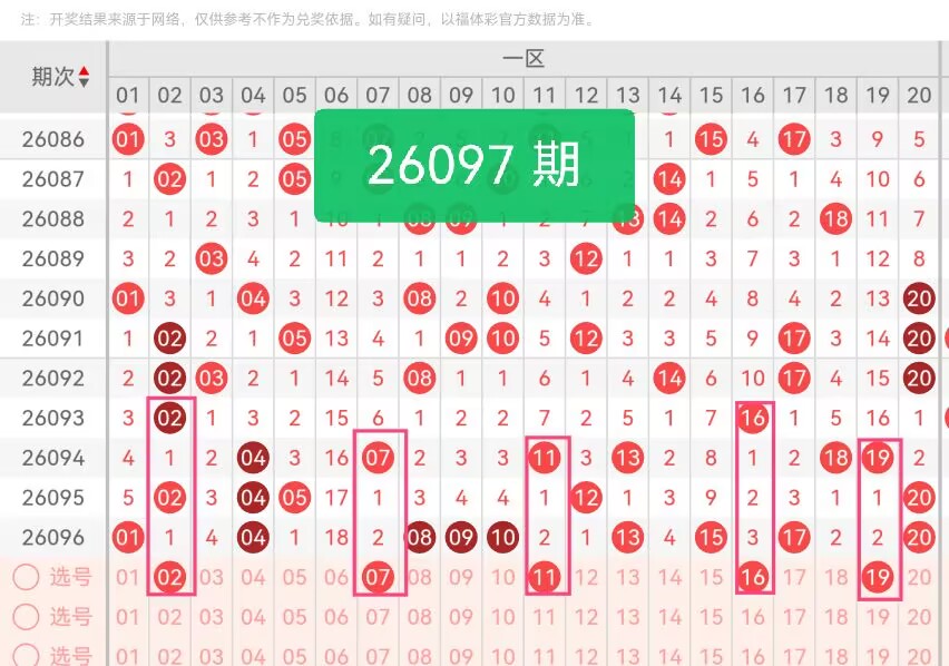 上期第一区间开奖9个号码,本期可能会减少开出。02为偶号,填补该区上期奇号扎堆的空缺,且是近30期仅开出11次的热号有回补潜力;07是近期热号,近30期落号8次,走势规律稳定,可作为区间基础号;11为形态均衡的温号,无极端冷热属性,适配区间降温后的平稳走势;16是隔期号,符合区间轮动的小周期规律,过往隔期落号概率极高;19为奇号,补充该区奇号热度,同时是近2期未断的核心号,具备延续性。