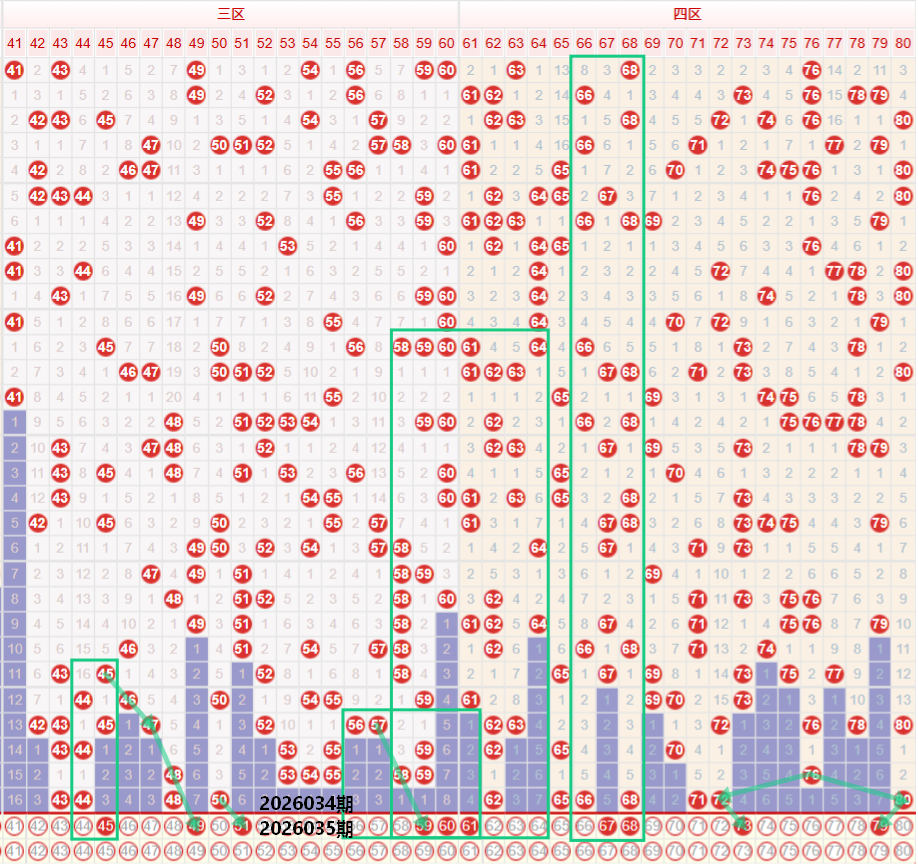 如图所示:在本期大数区的选号中注意在上期的走势中三区间开出了4枚中奖号码,在近期的走势中已经连续多期保持着均值或者是均值以上的走势本期要注意三区间的落号数量出现短期回调走势,在近期的走势中,44 45多次出现交替走势,在上期开出44之后,本期要注意45继续保持着交替走势,另外需要注意在近期的走势中,多次出现偶数或者是奇数的连续走势,在上期开出48 50之后,本期要注意52向后的延续走势,或者是直接考虑49 50的奇数走势,在上期的开奖结果中5字头出现了断号走势,本期要注意头尾的回补走势,重点关注51 60的双码走势,尾部位置注意连号走势,重点关注59 60 61的三连号走势,四区间上期开出了7枚中奖号码,从区间的最低位,直接上升值区间的最高位走势,在近期的走势中,单区间走势多见于连续走势,因此在上期四区间开出7枚中奖号码,本期要注意四区间继续保持着高位走势,重点关注在上期开出66 68之后,本期考虑夹号67的走势,在近期多次开出,或者是考虑66 67以及67 68的二连走势,尾部位置在上期开出71 72 80的首尾组合之后,本期考虑73 79同步向内收缩的走势,或者是在中段位置考虑一组连号走势,前段位置在上期开出62的位置下方继续考虑延续走势。