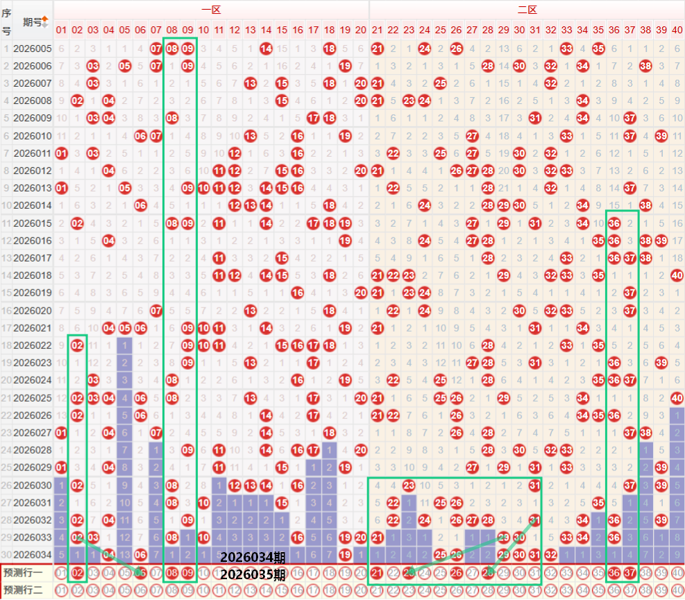 如图所示:在本期小数区的选号中,注意在上期的走势中一区间开出了3枚中奖号码,落位在区间的最低位走势,本期要注意一区间的落号数量继续保持在低位走势,在上期开出04 06的位置注意分两边的02 08偶数走势,以及要重点注02 04或者是06 08的偶数二连走势,在08 09 10的位置要注意考虑一组二连走势,1字头的走势上期也是近开出了一枚中奖号码,本期要注意1字头的号码继续保持低位走势,或者是考虑近期多次出现断号走势,本期注意1字头的号码出现断号走势,号码选择注意18 20的边号走势,二区间上期开出了6枚中奖号码,落号形态为两组连号走势,25 26以及29 30 31 32的四连号走势,本期要注意这里面26 29 32的同路三码出现重号走势,或者是考虑在上期的走势中21 30下方出现了重号走势,并且带出了31号,本期要注意21的 遗漏一期走势或者是考虑40的二区间尾部位置开出号码回补,可考虑37 40的双码走势,另外在近期的走势中,重号遗漏一期的落号形态开出逐步走热,本期要注意34 36的热形态走势,如果考虑36的遗漏一期走势,本期要注意36 37的二连走势。