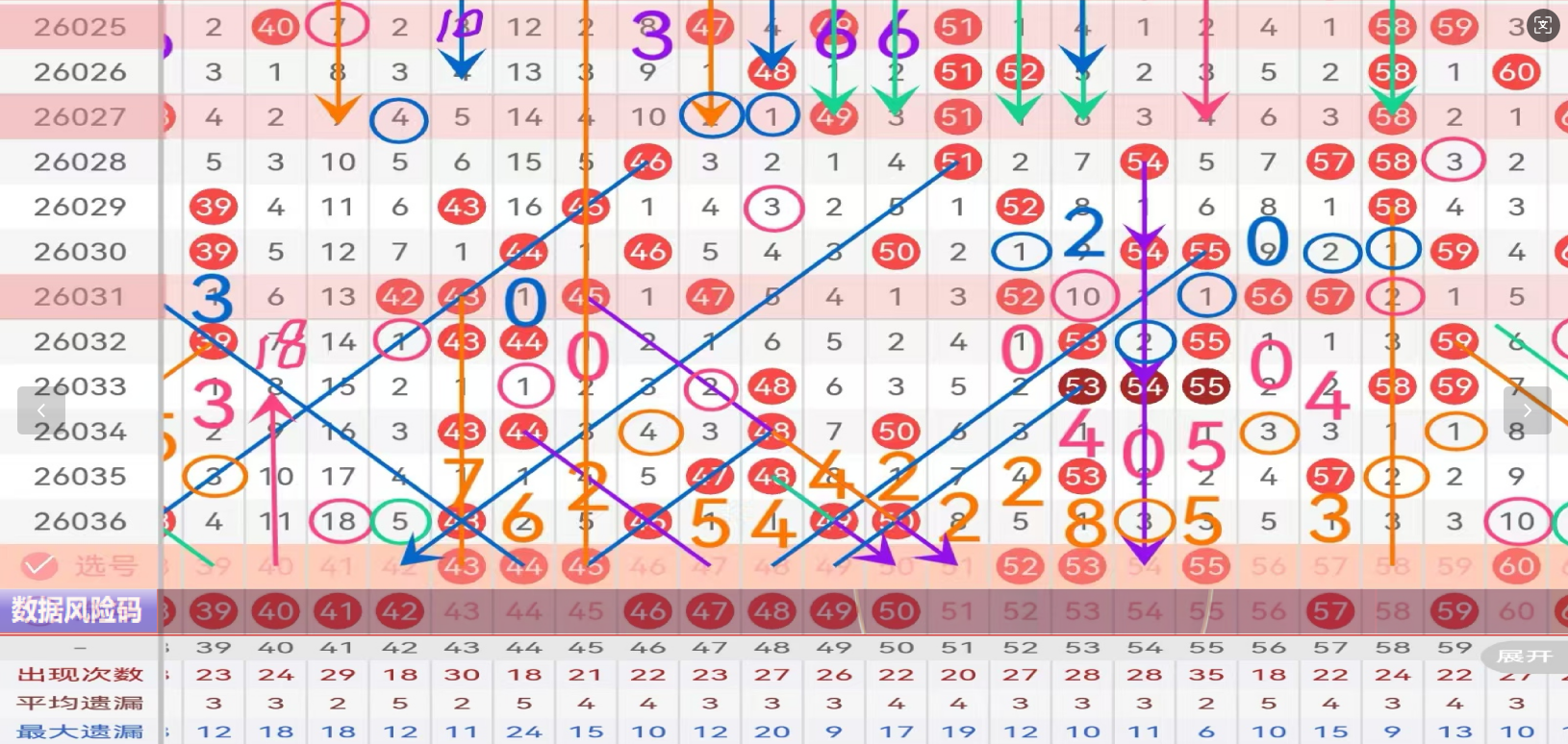 三区间上期出了4个号 码,温态开出;龙头41是本期唯一冷码,可持续关注防守即可;孤码43这里可看重带上44做4字头的连号防守,甚至45的四斜连还是有机会的;46-50本期暂时不考虑;三区本期重点在5字头,52 53 55假四连是九哥本期推荐的5字头重点三码,数据及走势属性均符合做号标准,也是不错的复式码选择;54 16本期均是123顺位遗漏,二择一推荐了16,那么这里的54以防为主;56 58小防;尾部60是本期独十遗漏码,近期独十开出频率不是太高,上期的独十40也没给,所以本期60可保持关注为宜;
