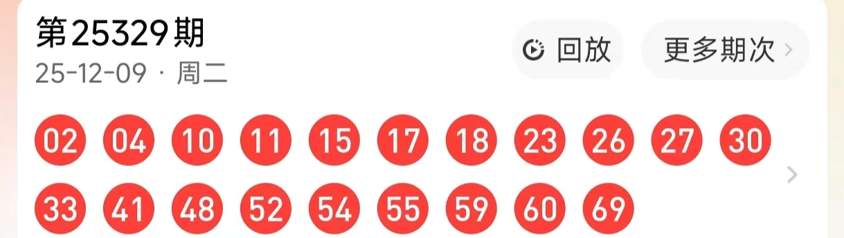 - 41-60区间:45、47、53、59(4个号,59是25329期的重号,再补仨冷够8-10期的号码,冷热搭配着来更稳妥);