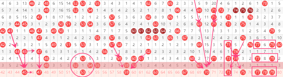 - 三连号1组:77-78-79(高区上期出号少,三连号跟着走势走,爆发力拉满,正好补高区的缺口);