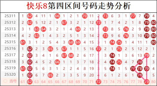 四区上一期主打号码因为五重走势的现身被挤兑一空,好在后端的三重号做了及时的跟进,本期四区应该是重号到了巅峰,接下来重号要转弱的可能性非常大。且四区前期热出的65、68、71等斜连号需防范回调,避免追高。鉴于五重号集中爆发后能量释放充分,本期宜以冷温号为主攻方向,重点关注62-67区间补位机会,尤其63与66已进入高遗漏警戒区域。同时观察末端76-80段是否借势启动轮动,该区间沉寂已达六期,存在反向回补可能。布局上建议压缩重号占比,侧重中低位温码的串联搭配,提升组合弹性。