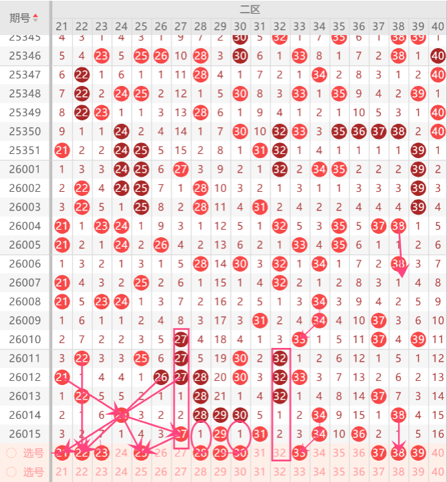 二区间注意打底号是21.22.23.25.28.30.29.32.33.35.37.38.39中关注3-4码开出机会。