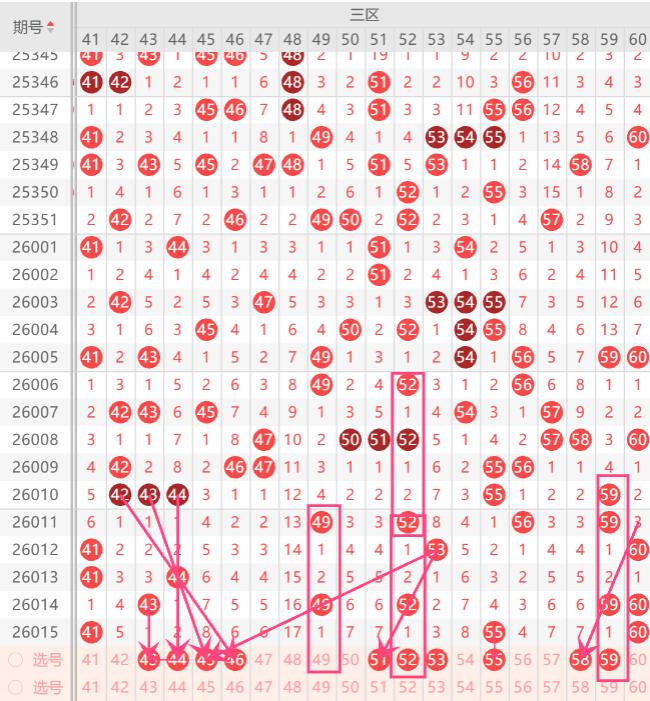 三区间在近期的走势上分析,上期三区间开出了3码,而且整体区间还是一个温热形态,上期三区间开出的形态是隔期回补和重码回补走势,上期小妹在文章布局到了2码开出,那么本期三区间我们要重点关注的形态是对称形态,空位回补,重码走势,首先我们注意对称形态上的44.52.中选择一码开出机会,而空位回补上注意45.46.51.53.58中布局1-2码回补机会,至于重码走势上的41.55.中防守一码走重机会,那么本期重点关注在隔期回补上的43.49.52.59中布局一码订胆机会,如图所示。