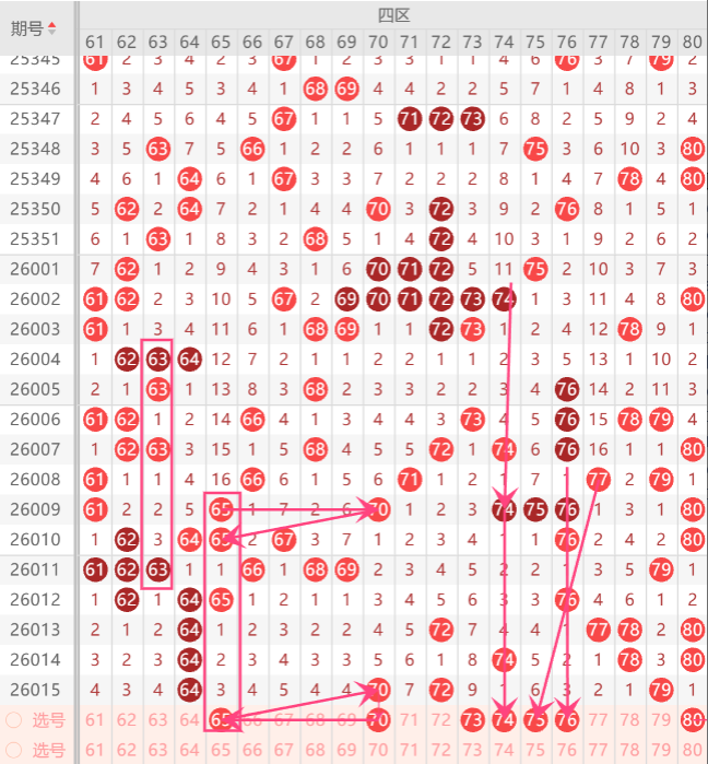 四区间的打底号是61.62.63.65.66.67.70.74.75.76.73.80中参考4-5码开出机会