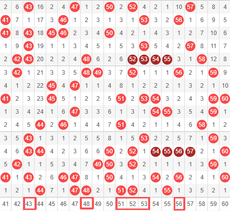 三区推荐号码为:43.48.51.52.53.56。其中48是二区冷号,上期与47开出双连号,推荐本期48继续回旋。本期重点推荐43,43经常开出直连号,跟邻号44多次出现斜连,上期44开出,本期43继续大热。推荐连号51.52.53。上期女神推荐51+52+53三连号,上期开出51+52双连号,本期继续推荐这三个号连号。56备选即可。