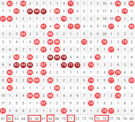 首先我们看下上期数据,和值为768。 奇偶比例为:11:9。 出了六组双连号,分别是06+07,20+21,31+32,47+48,51+52,76+77 。 直连号出了3个,分别是21,32,47, 其中21和32为三直连,47为两直连。未出现断层区域。我们把 01-40划分为前区,41-80划分为后区,则小号偏多。未开出冷号,均为热号和温热号。