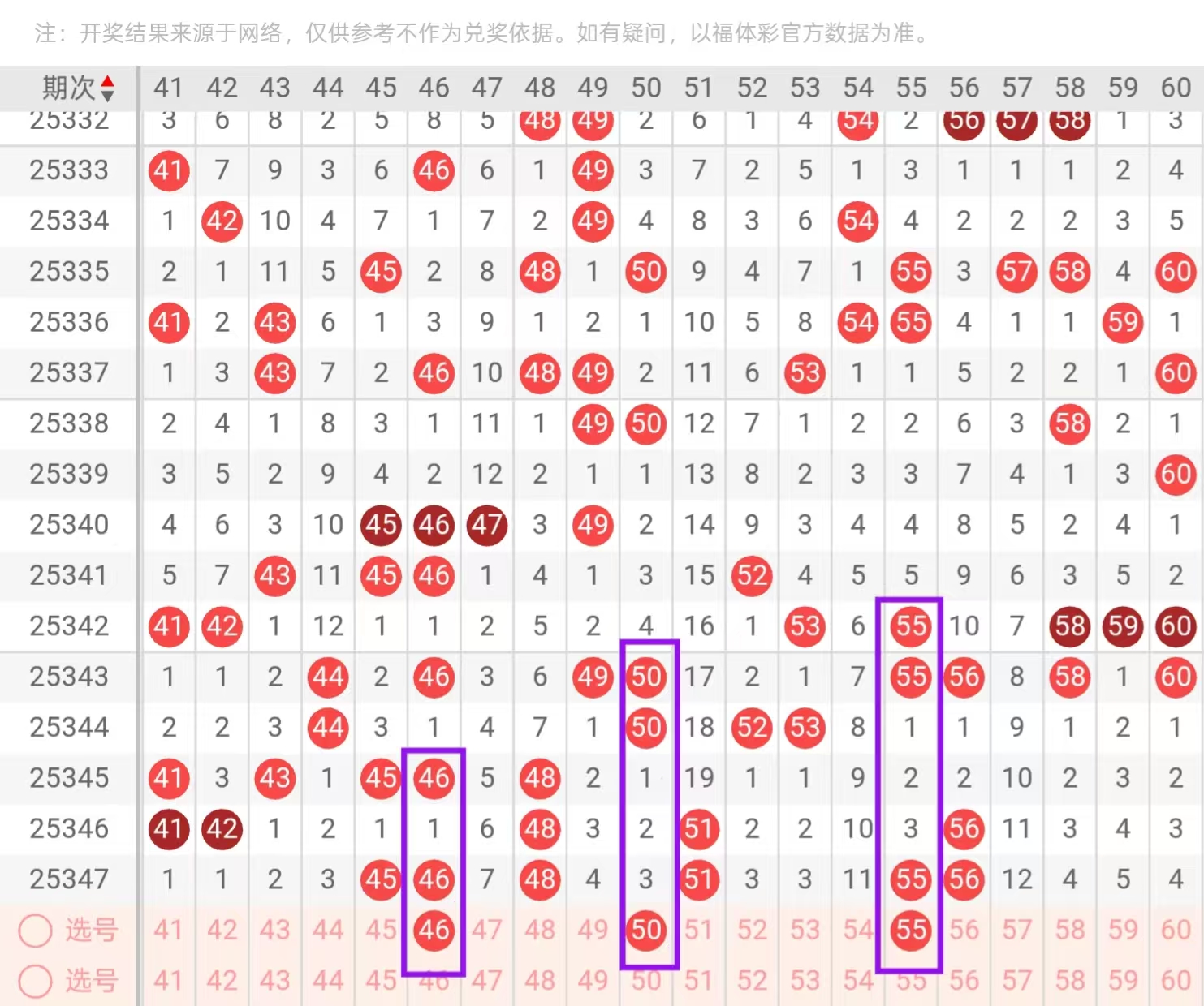 三区41-60:三区间,上17回补了6个号码的下落,从近期三区间号码下落点位来看,一直持续走热和回补大遗漏,今天我们要重点关注的是三区间对子下面的回补,和重码的一个下落点位,在4头,首先我们要重点关注的是41-42-2下1的选择和重码45-46-2下一的选择,在这里可用41-45的搭配和42-46的搭配回补,回到五头位置,今天这里我们要重点关注的是50-52-2下一的选择和55-56重码2下1的选择,今天这里可用50-55的搭配和52-56的搭配回补,在尾部位置,这里值得我们重点关注的是形态号码的一个回补,和59-60对子下落的可能。