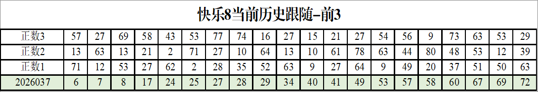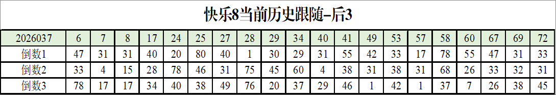 我感觉选热的同时,还要注意防冷条件开出,可以直接选取每个号码跟随出次前三的号码,也可以考虑把出次最后的三个数字加进去,不过这样可能号码太多,可以尝试。图上也能看出单独号码跟随的情况,我就不一一统计每个号码的出次了,我这里考虑提高概率,取每个号码历史跟随的前三号码和后三号码,根据2026037期的号码,我关注正数3和倒数3的号码号码为: