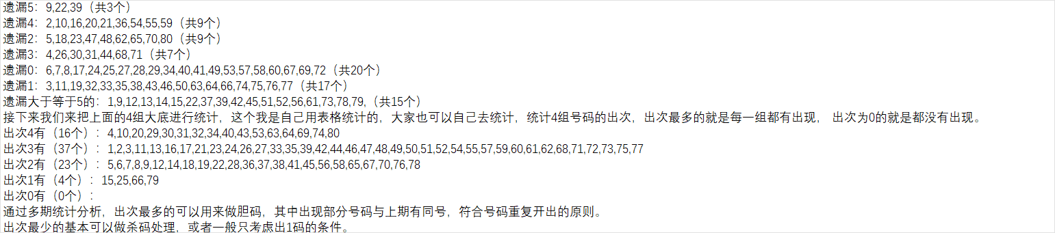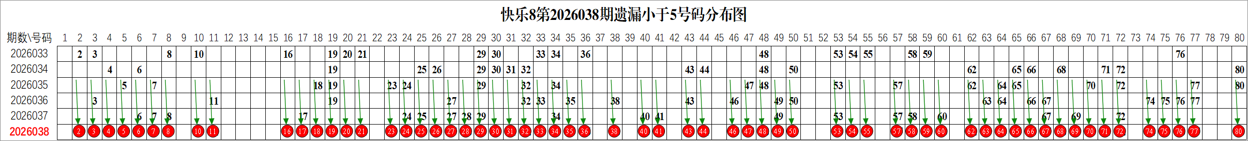 所以这个条件值得关注,从号码分布图上我们可以分析出,遗漏小于5期的号码有: