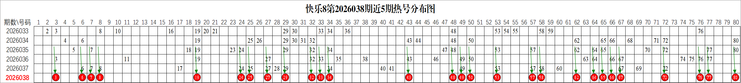 这个条件可以理解为追热号,主要是选取遗漏小于5期的号码来做大底,通过号码分布图我们也能看出,每期都有重复号,都有上期号码的相邻号,再仔细观察下面的部分分布图,2026037期,按照【号码(遗漏)】的方式统计出来是:6(2),7(1),8(3),17(8),24(1),25(2),27(0),........。可以看出遗漏小于5的号码比较常见,这就是一个大概率事件,我们就可以用这个梳理出一部分号码,用来作为我们交集的一组号码。