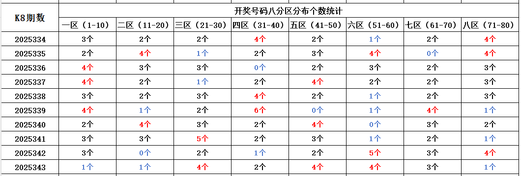 首先看上期回顾,“快乐8”第25343期开奖结果:4.11.23.26.29.30.33.35.44.46.49.50.55.56.58.60.62.65.69.80;通过分析开奖号码,分享第一个数据分析:统计开奖号码的八分区冷热走势,判断出号规律。以近10期开奖号码的八分区统计数据为例: