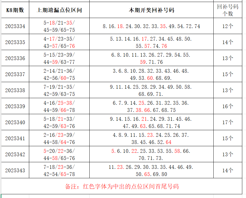 如图,上期的遗漏号码在下期开出10个左右,即为回补号码。定准点位区间首尾号码是关键!以上期2025343期为例,定位4个遗漏区间,围中14码!结合上期开奖号码,以跨度值大于或等于7为依据,本期关注4个遗漏区间:4-11/11-23/35-44/69-80;重点关注遗漏区间:5-16/23-35/45-59/61-74,区间遗漏号码可能在本期回补开出。注意区分遗漏区间回补号码和大底号码,不要混淆。个人分析,仅供参考。