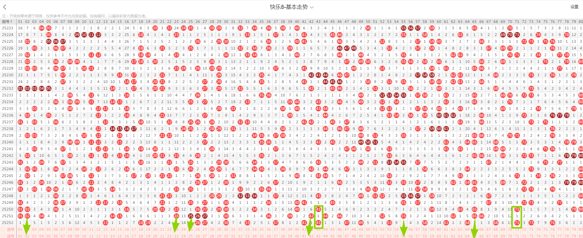 从这张走势图可以看到我画标出来了遗漏示意号码,开出了隔期(遗漏一期的)2个号码(绿色方块标示的),从近期走势图看隔期有回温态势,本期判断6个(绿色箭头标示的:02、23、25、42、55、65)需要关注,有下号概率;