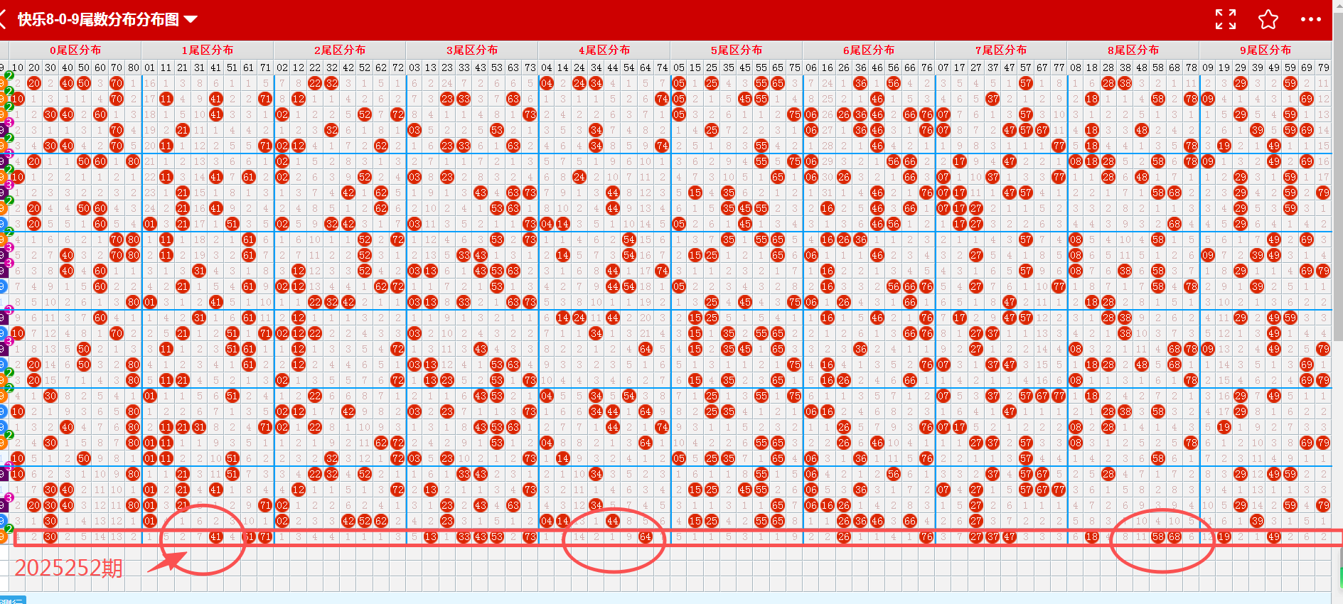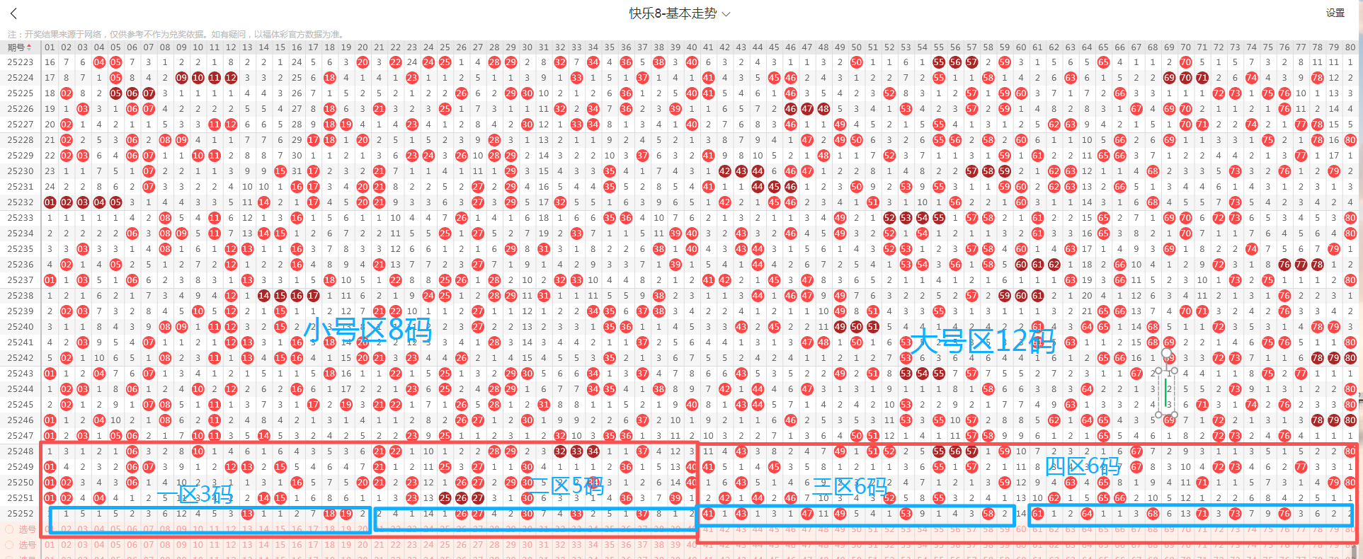 上图是快乐八2025252期区间走势图,从图中看到小号区(1-40)开出8个出奖号码,从开出数量上看与上期开出数量有所减少,热度上回落,从小号区近10期出号情况看,整体小号区前区近期偏温趋势;大号区(41-80)本期开出了12个出奖号码,从开出数量上看与上期开出数量有所增加,热度升温,从近期出奖号码个数看属于偏温态势,下期快乐八2025253期大号区号码大概率热度回温,大小区间主看大区号码热度回温,大小比具体区间比可参考11:9,防10:10的比例;再从细分区间来判断,按走势图四分区分成四个区间,一区(1-20)开出来的号码有3个;二区(21-40)开出来的号码有5个;三区(41-60)开出来的号码有6个;四区(61-80)开出来的号码有6个;数据上看本期出奖号码集中分布在三、四区。从号码落位区间形态上看,快乐八2025253期主看二、三区热度回补的态势,落号几率较大,建议密切关注。