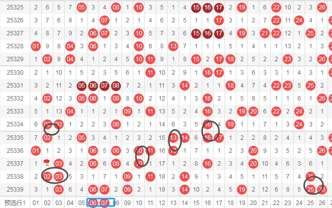 上图是福彩快乐8开奖号码分布走势图,我在上面图中红色圈圈标注出来的都是连号,因为上面开出了连号0607,然后你们在看看最近开出来的连号,也就是我用黑色圈圈标注出来的地方,每组连号后面的一期都会重复一个数字,也就是说上期出现了连号0607,那么本期这两个数字0607本期得至少重复一个数字,也就是0607关注出1个或者2个。