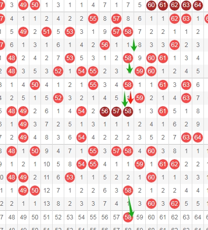 上图是福彩快乐8开奖号码分布走势图,我在上面图中标注的数字是58,你们看看最近十几期里面开奖号码58都是隔一期就出现,隔一期就出现。上面我用绿色箭头标注出来了,那么既然数字58有这个特点,那么本期是不是可以关注一下数字58会出现呢?因为数字58刚好又是隔一期了,按照上面这个特点,本期数字58可以关注一下。