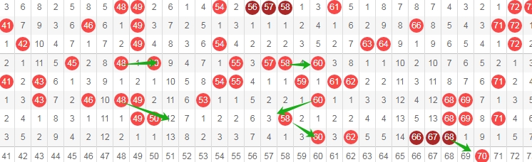 上图是福彩快乐8开奖号码分布走势图,我在上面图表中用绿色箭头画起来的地方就是我要说的,你们看看这8尾数的数字后面或者前面都跟着0尾数的数字,你们看看数字58后面出现了数字60,那么既然上期出现了数字68,那么本期是不是会出现数字70呢?