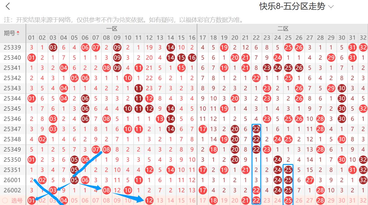 本期的一区注意斜三连2.3.4,跟上面的5.6.7刚好连起来了,那么这个4就要注意了,其次看好有1尾即1.11出一,看好1,另外看2尾似乎也有号,即2.12出号,比较喜欢斜连号5.8.12这个走势,结论一区三胆1.4.12,二区关注25继续出四直落,有没有发现二区的四直落跟疯了似的,直接按住25,其次二区的2尾大热,注意22.32出一,倾向22,注意8尾的18.28出一,倾向28,边号看好21,结论二区重点关注18.21.22.25.28,四胆21.22.25.28,三胆21.25.28,双胆21.25,主胆25.