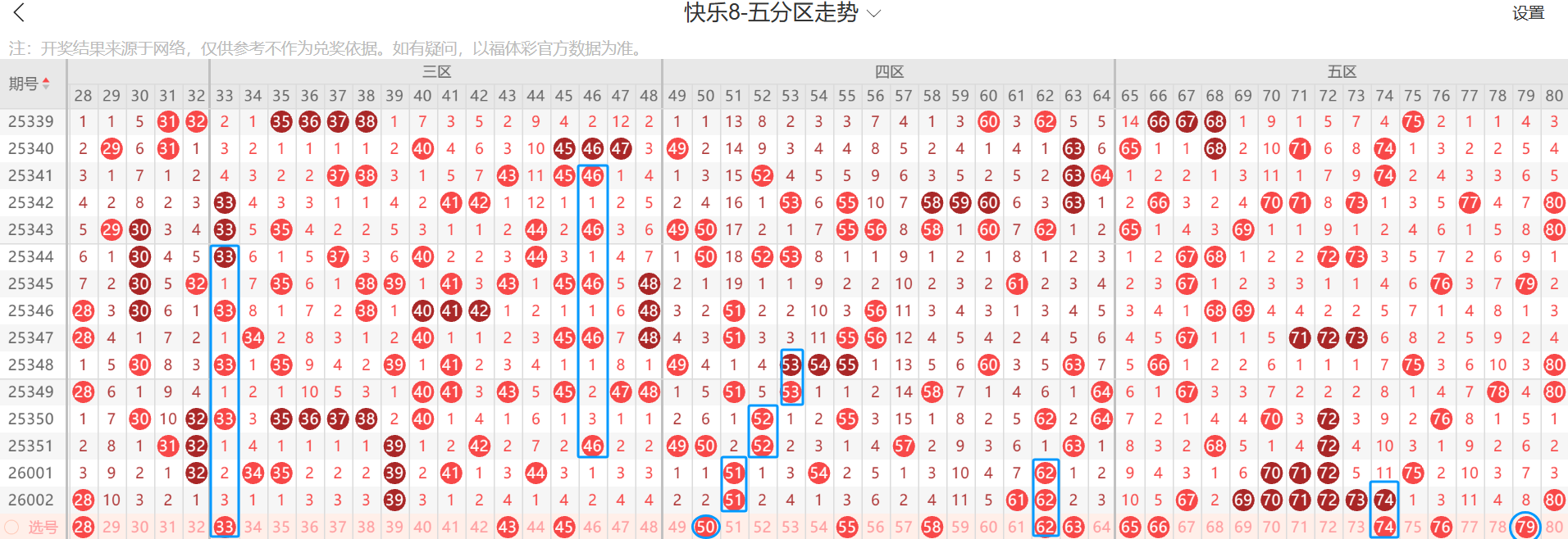 五区看好74继续出重号,看66.76出一,倾向是76,至于65.79我认为是有出号需求的,本期热区倾向是五区继续走热,其次关注四区,结论是五区重点关注66.76.74.75.79,胆码74.76.79,双胆74.76.