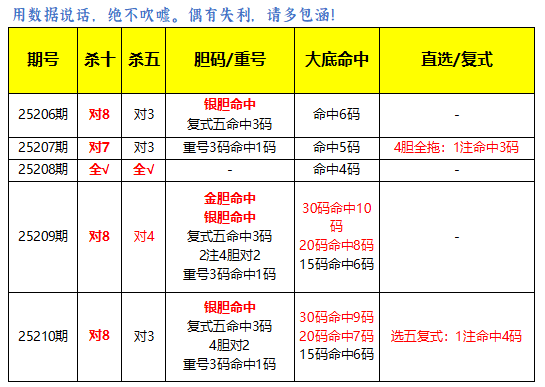 上期杀10码对9,免费文章中杀5码对4。金胆银胆均命中,复式五2注命中3码,4胆全拖对2,选三对2。