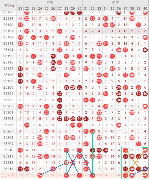 四区开出:31,37,38,39,40 奇偶比: 3:2 和值:185 跨度:9,上期开出5个号码,奇数号码占优势。本期无三斜连走势,隔码斜连走势:32 38,近10期平均出号2.8枚。本期推荐关注号码:32、37、38、40。