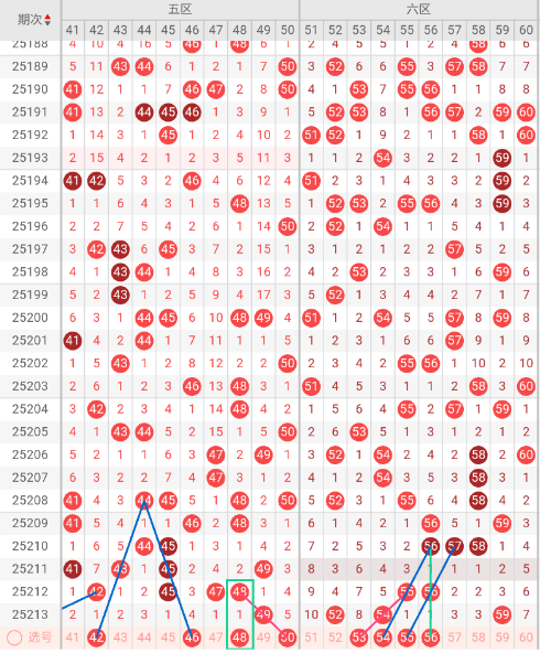 七区开出:(未出号),上期开出0个号码,本区空开。本期三斜连走势:70,隔码斜连走势:68。近10期平均出号2.2枚,本期推荐关注号码:62、65、68、70。