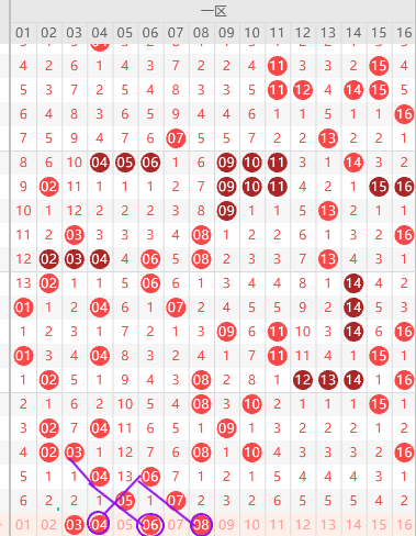 三区胆尾5尾7尾,边号33 35 46 47出1码,重号34 47 48出一码,形态上36 46是斜连号,上图已勾画,4尾出4期本期先看44其次34,大概率34 44二出一,重号先看48 其次34,大概率34 48二出一,连号出多期,本期连号42 43或者35 36, 遗漏值35 42 45三出一,防38结论关注五码33 35 36 37 48防38