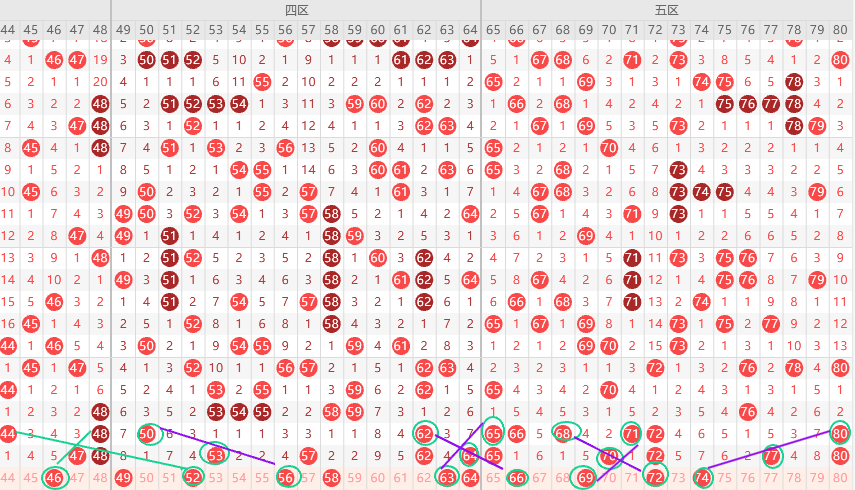 四区胆尾7尾8尾,边号52 54 56 58 61 63出1-2码,重号53 57 64出一码,形态上52 56 63是斜连号,上图已勾画,缩小范围,四区是走热趋势,本期大概率能出4-6码,49要防守一期,其次6开头走热本期60 61 62 63 64大概率出2码,重号先看64其次57,结论关注五码56 57 58 63 64防52