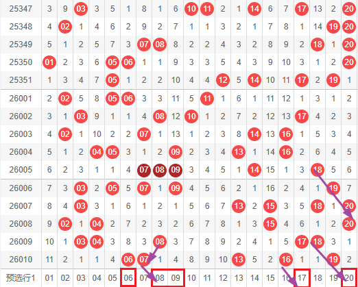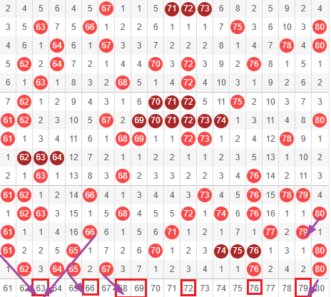 首先我们看下上期数据,和值为854, 奇偶比例为12:8,出了两组两连号,06+07,64+65, 一组三连号,42+43+44,直连重号出了6个,分别是37, 42, 55,65,76,80, 均为两连重号,我们把 01-40划分为前区,41-80划分为后区,则大号偏多,均为热号和温热号。