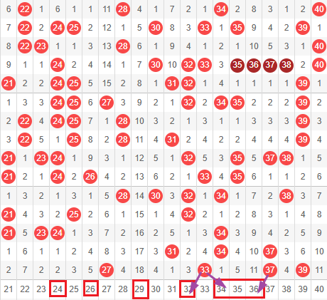 34+35+36: 这个推荐我们前几期讲过,1+1模式,下期回补中间号码,就是上期开出了33,37,本期推荐中间的34.35.36回补,或者三选二。