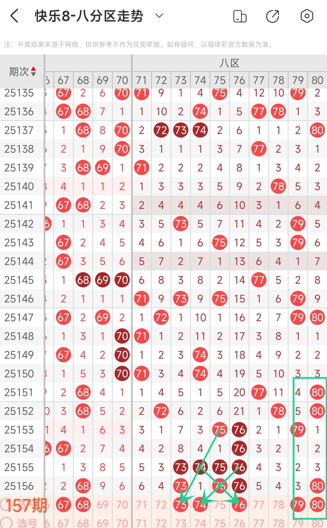 上期八区开出73 75 76 80 这4个号码, 本期可以考虑3个左右