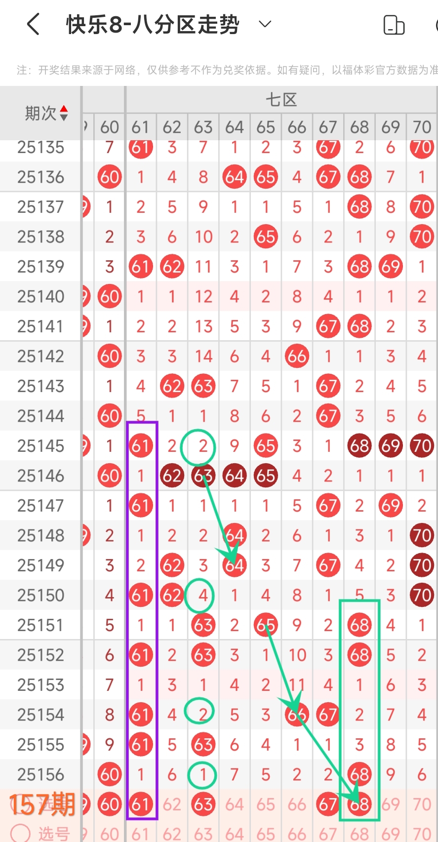 上期七区开出68这1个号码,本期考虑出2个左右。