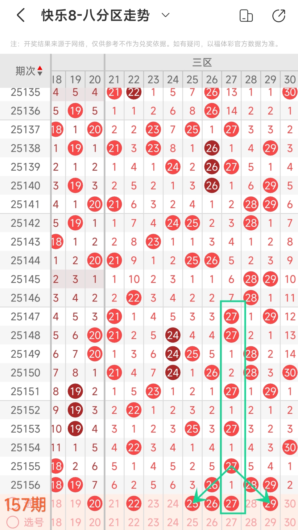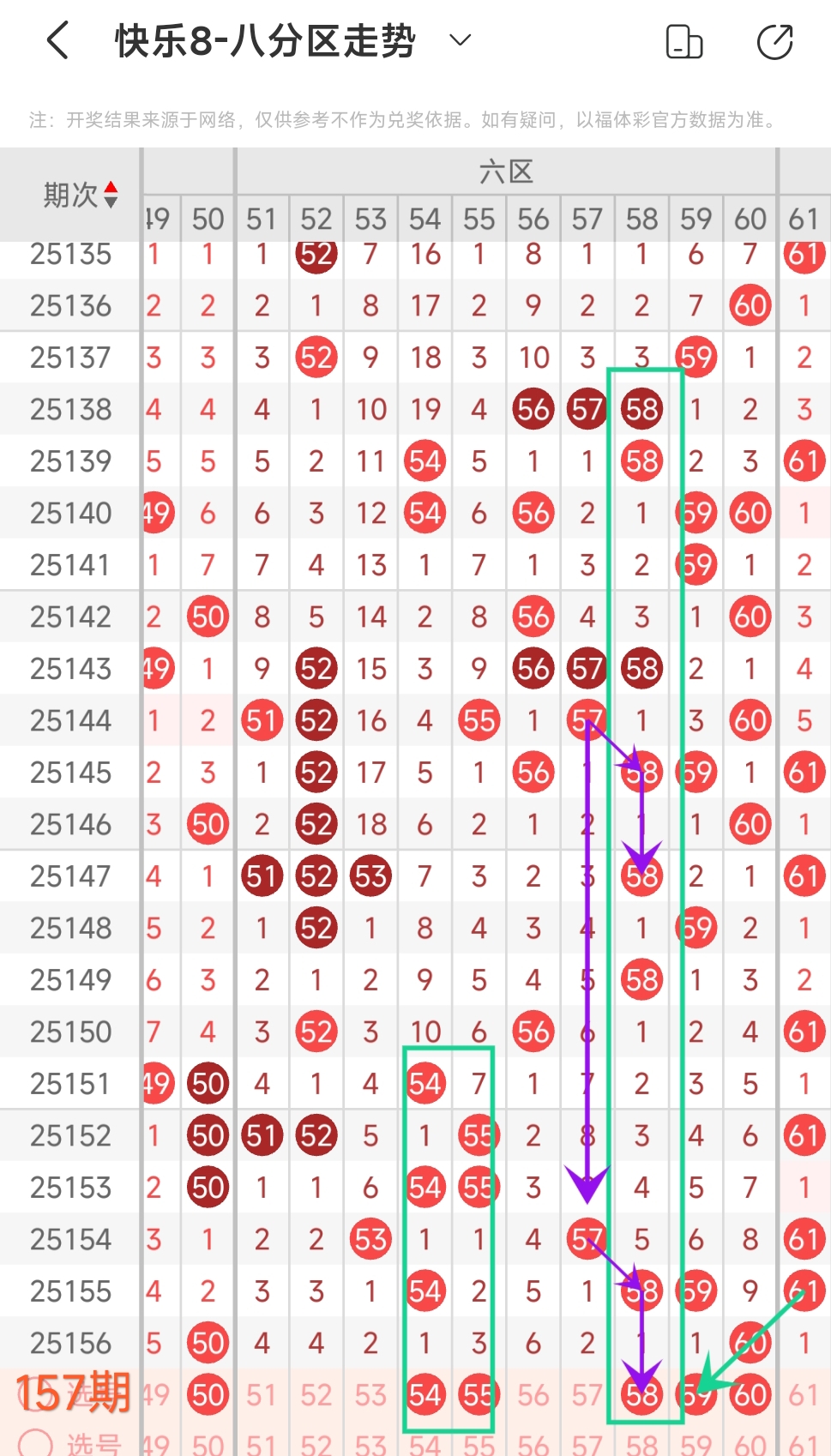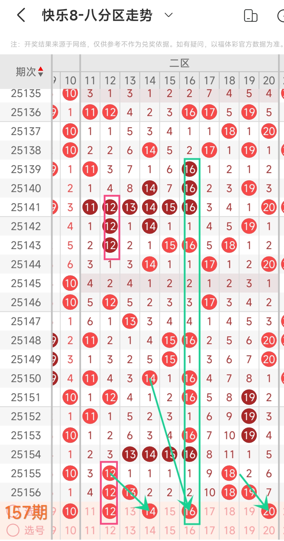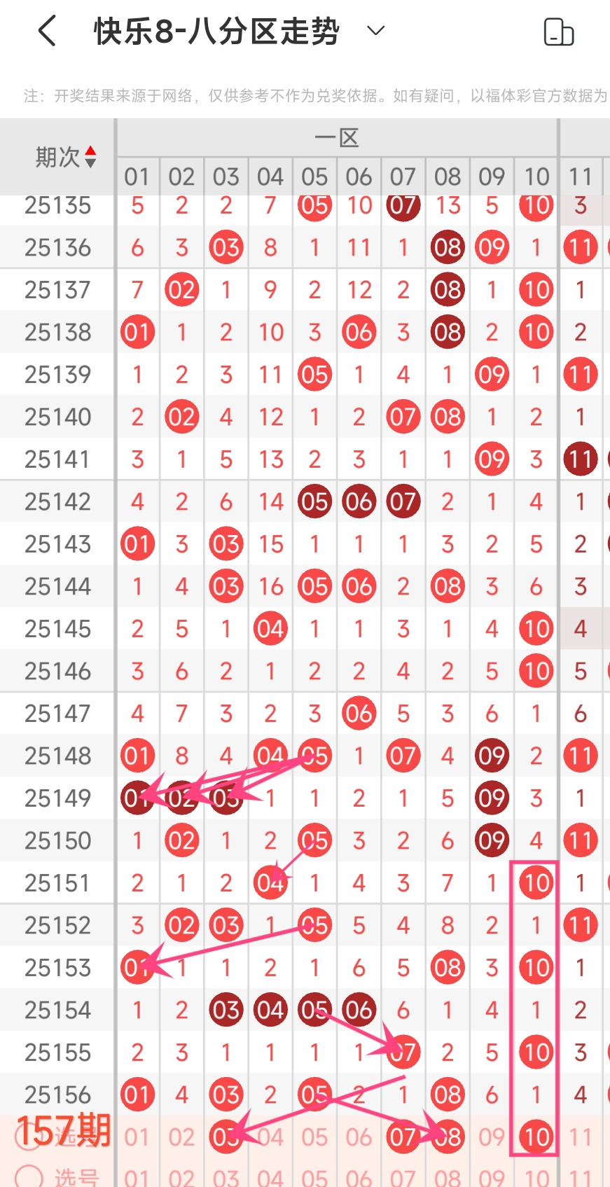 在快乐8的探索之旅中,通过对开奖走势图细致入微的观察,我们总结出一些具有参考价值的规律。几乎每一期开奖号码都呈现出以下显著特征:其一,大概率出现连号;其二,常常伴有边码;其三,遗漏值为1 2 3的号码频繁现身;其四,重号现象也较为常见。掌握这些要点,能为我们的投注提供方向指引。我们约定采用八分区走势图来展开分析。