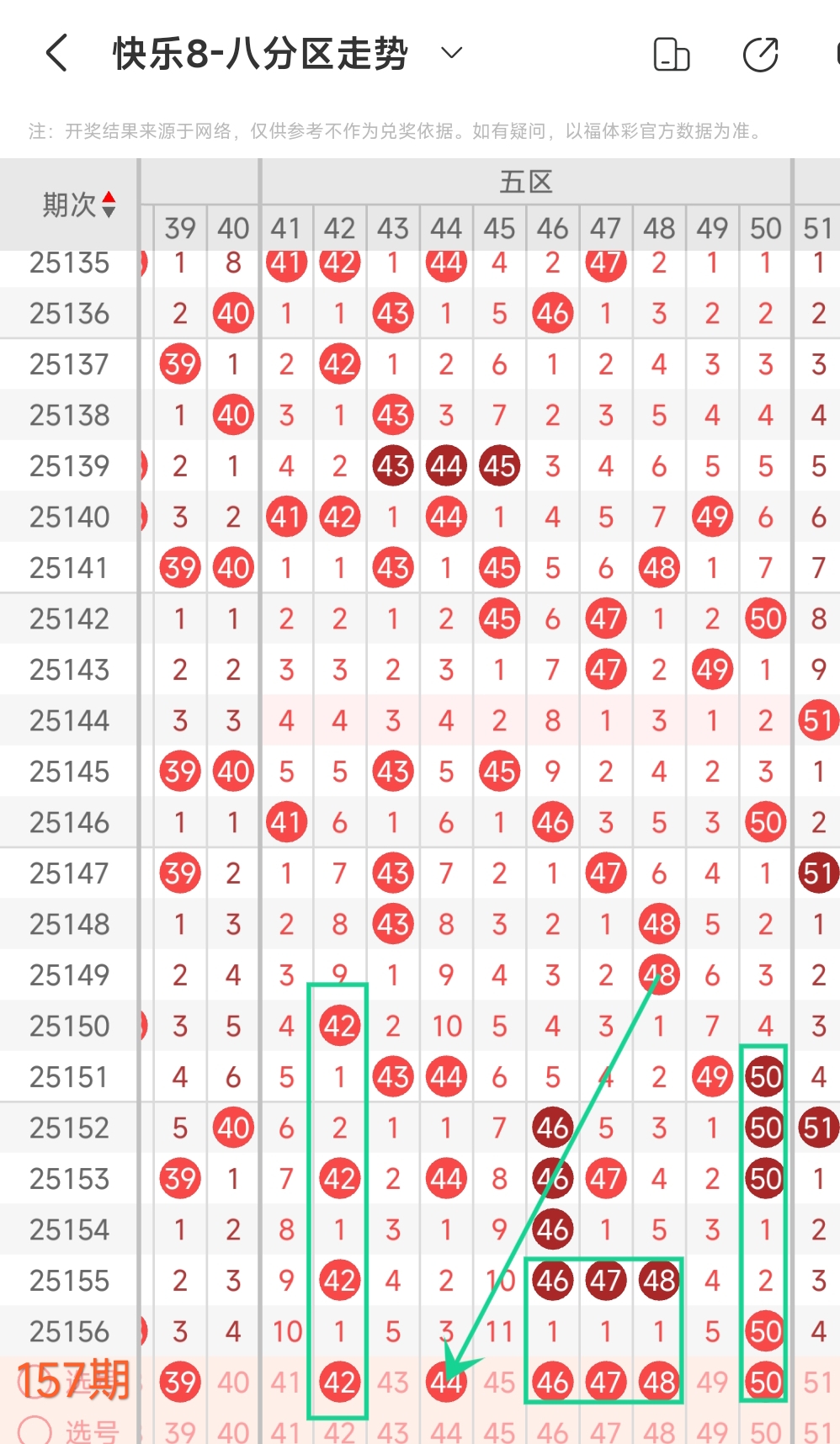 上期五区开50这1个号码,本期该区应该出号3个左右