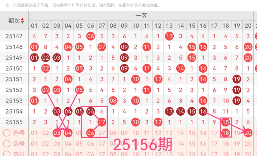 01-20区间,上期集中开出了4个号码(07 10 12 18),此区间出号较少,但短期内热度过热,本期可能会出现一定程度的降温,预计有2-3个号码的开出空间。从历史数据来看,这个区间的号码往往呈现两种形态:要么是连续多期集中在某个小范围(如01-10段),要么就是呈现散点式分布。号码20已经遗漏了6期了,本期根据划线走势来看,极有可能会在本期出现。18这个高频冷号虽然上期刚出过,但按以往经验,它经常会再次出现。前期开出的07常会带动其附近隔期斜连号的出现,如号码06。号码03和号码04最近较热,有较大的出现概率。因此综合推荐该区间号码【03 04 06 18 20】