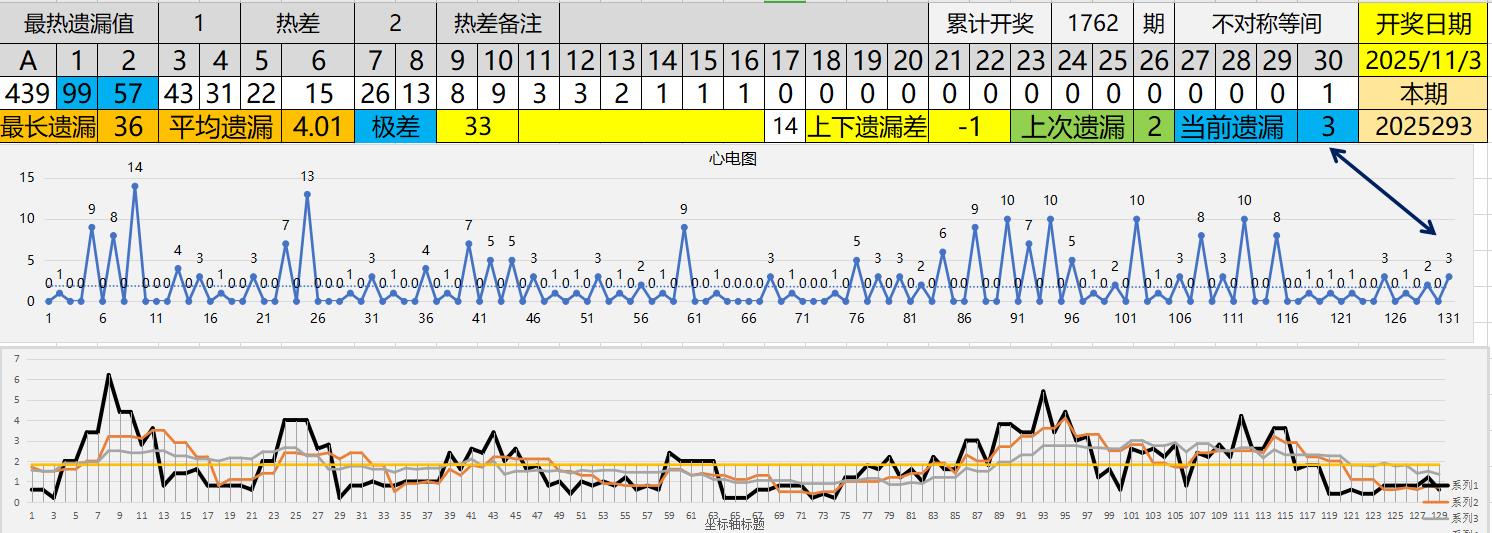 3、从上次遗漏10开出后开始的本轮长周期,期间遗漏峰值8,接下来最高就是遗漏3,而遗漏3也是最近一个月来除遗漏8之外的封顶遗漏值了。