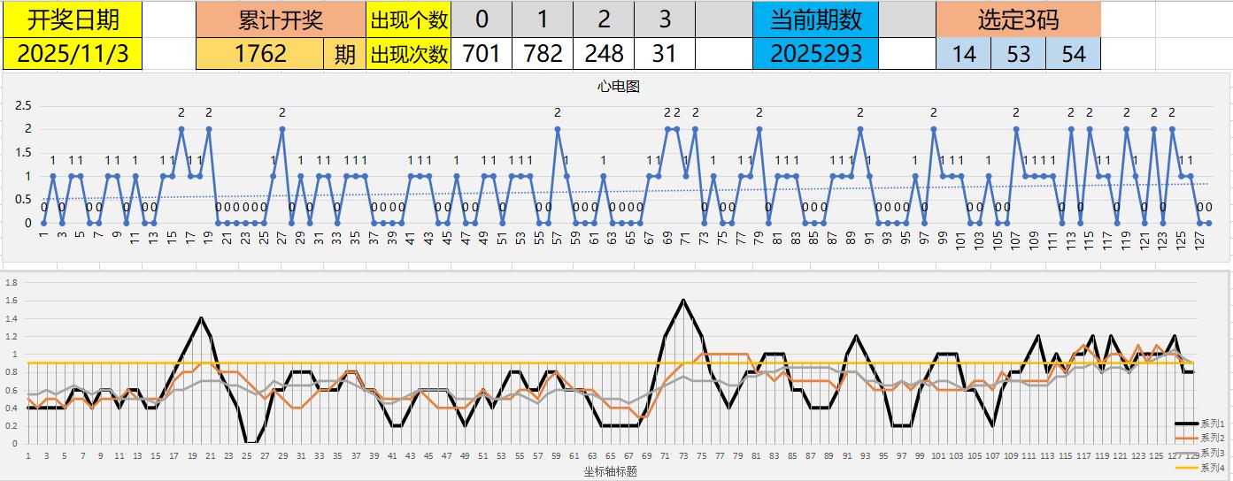 那这3码(14,53,54)同时开出情况如何呢?见下图: