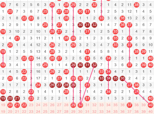 第二区间首先看龙头位置的三连有机会下落,大家可以自己防守一注。然后看 29的复制形态有机会下落,30的 三斜连一样有机会同29成对子回补下落,尾部看好 一码37有机会下落,40可做重防守一下。该区间可推荐的选二搭配组合有29 30或者37 40.第二区间胆码主看29 30 37 40